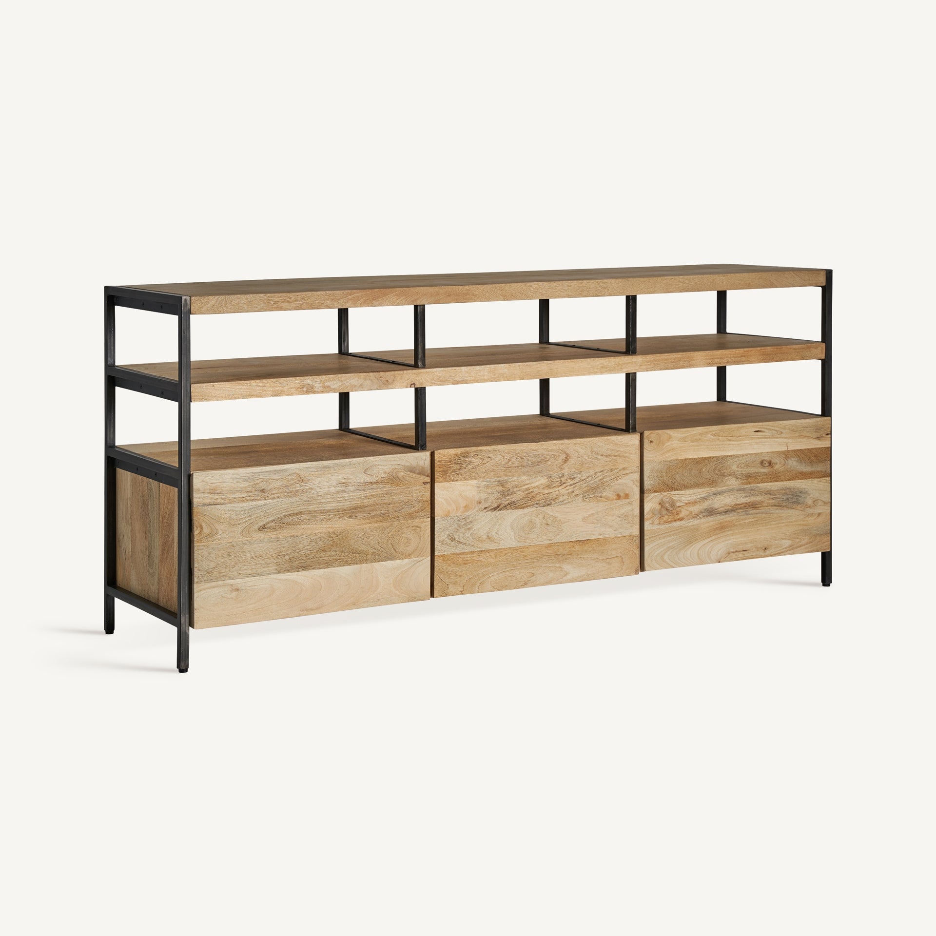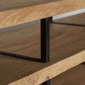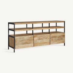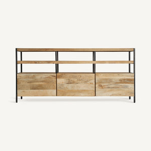 Comoda Celle, stil colonial, realizată din lemn de mango maro deschis, combinat cu fier.