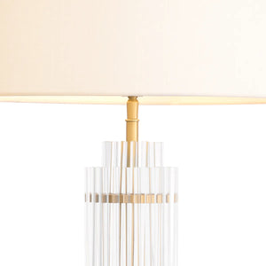 Lampa de masă East este un corp de iluminat uimitor care emană eleganță și rafinament. Finisajul său din alamă antică și baza din sticlă transparentă adaugă o notă de farmec vintage, în timp ce abajurul inclus completează designul general.